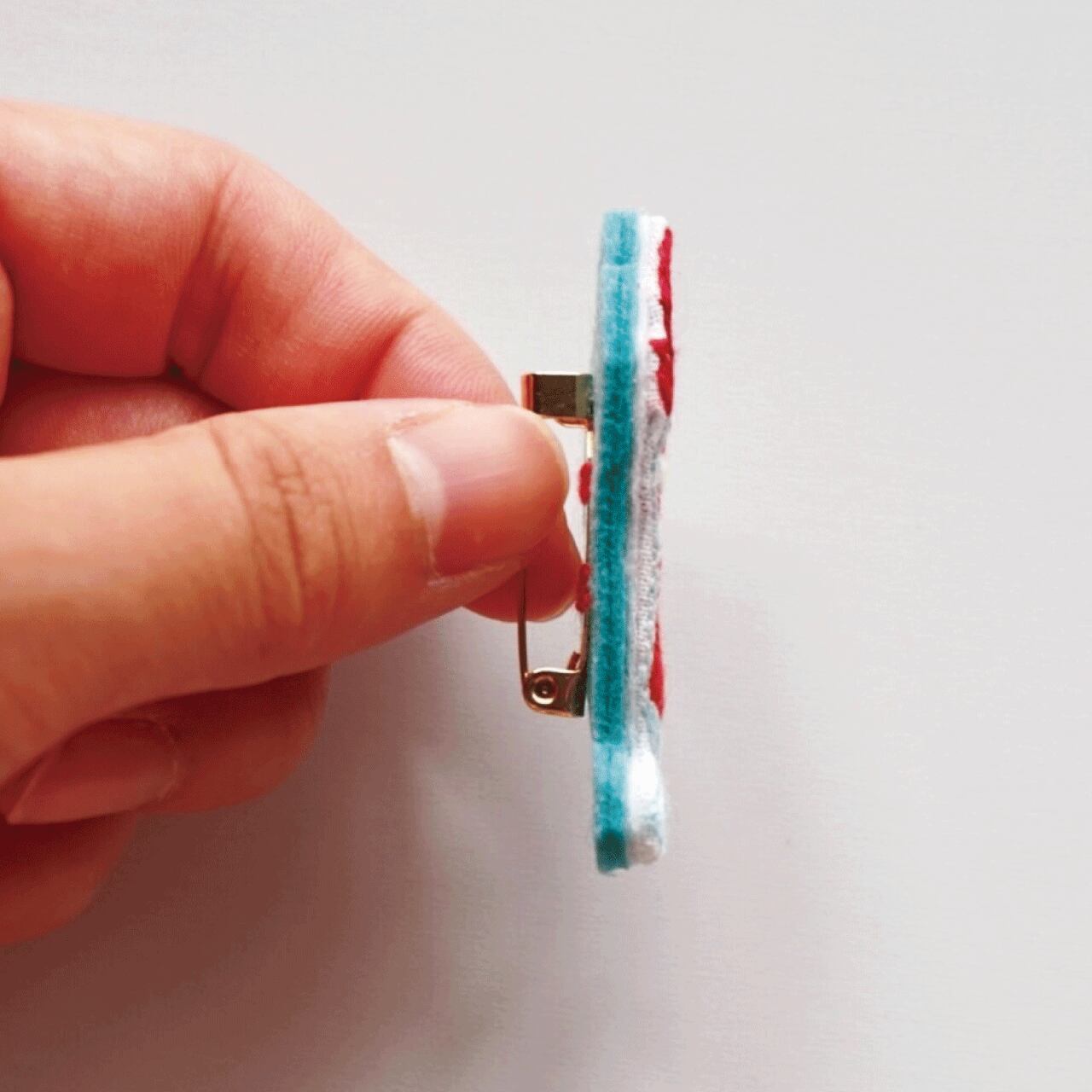 素材:フェルト、布(コットン100%)、刺繍糸(綿100%)、ブローチの金具